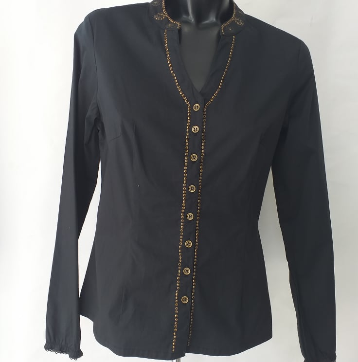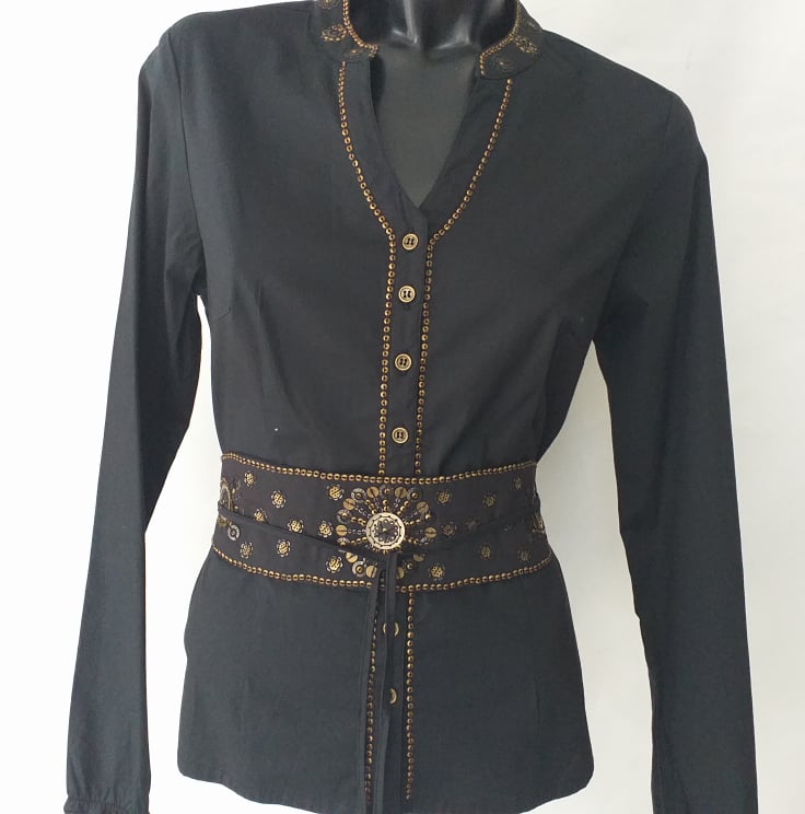 και κέντημα από μπρονζέ χάντρες στο κολλάρο και κατά μήκος των κουμπιών.